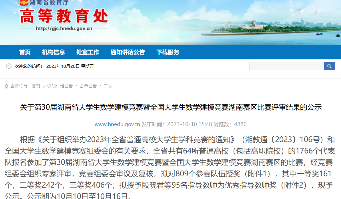 近日,2023年“高教社杯”全国大学生数学建模竞赛和湖南省高校第八届研究生数学建模竞赛成绩分别揭晓,我校参赛队伍获全国大学生数学建模竞赛一等奖2项、二等奖4项、三等奖21项;获湖南省高校研究生数学建模竞赛一等奖3项、二等奖2项、三等奖1项。数学建模竞赛获奖数量、质量均取得历史性突破。