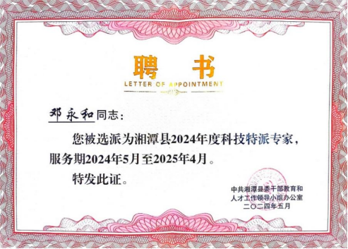 邓永和教授是湖南省新世纪121人才,湖南省高校青年骨干教师,湖南省和益阳市专家工作站首席专家,湘潭市高端人才,湘潭市新型工业化高级人才,湘潭市、县科技特派专家。2023年,其作为首席专家的湖南科鑫泰电子有限公司专家工作站帮助公司更高效的突破对钽酸锂新材料的黑化工艺的研究,提升公司技术创新和产品竞争力,成功入选湖南省专家工作站。