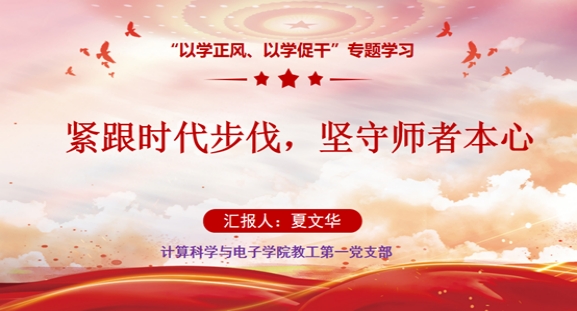 校优秀共产党员夏文华讲了一堂《紧跟时代步伐,坚守师者本心》为主题的党课。夏文华阐述了“以学正风、以学促干”的内涵,领学了习近平总书记关于教育工作的重要讲话,介绍了高等学校课程思政工作的推进情况,并分享了自己在课程思政教学中的实践经验和体会。