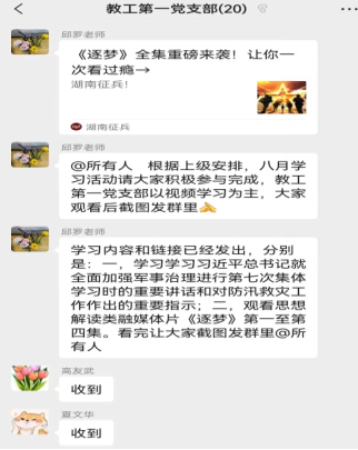8月15日,教工第一党支部在线开展“弘扬建军精神,坚守初心使命”主题党日活动,支部书记邱罗主持。