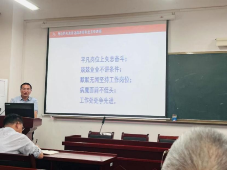 邓永和依次讲述了战斗英雄张富清、核武器专家林俊德、杂交水稻之父袁隆平、天眼之父南仁东和核潜艇事业领导者黄旭华的故事。这些优秀的老党员始终坚守共产党人的初心和使命,为了民族独立、国家富强、人民幸福,敢于牺牲、乐于奉献,在各自的领域里做出了巨大的贡献。邓永和还介绍了大家身边的优秀党员许迈昌老师和龙玉华老师的故事,他们在平凡的岗位矢志奋斗,兢兢业业,用实际行动诠释了共产党员的高尚品格。