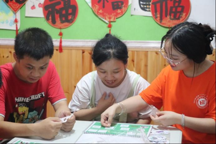 实践团成员陪伴特殊教育群体进行剪纸和绘画活动。实践团成员耐心地指导,一起创作,共同完成了一幅幅充满创意和美感的作品,不仅培养了特殊教育群体的观察能力和动手能力,更激发了特殊教育群体的想象力和创造力。