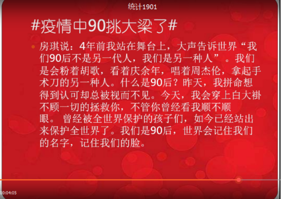 本次比赛以班级团支部为单位,通过演讲、PPT演示、案例讲解、微视频制作等方式呈现,参赛者们紧紧围绕主题,以多样的视角全面展示了新冠肺炎疫情期间大学生或者“90后”冲在一线的感人事迹,“哪有什么白衣天使,不过是一群孩子换了一身衣服,学着前辈的样子,治病救人、和死神抢人罢……”,充分展现了我国抗击新冠肺炎疫情取得重大突破之后我院学生的爱国之情和强烈的责任意识。