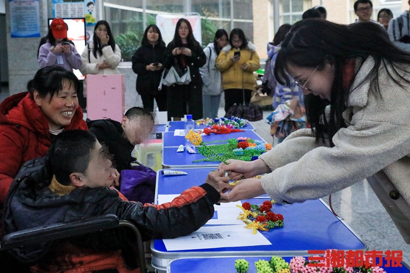 在电气与信息工程学院大学生创新创业实践基地,一个机器人引起了他们的注意。“来,你们也来试一试。”在老师的引导下,坤坤、寅寅拿起控制器一按,机器人一会儿走路,一会儿做俯卧撑,不停变换各种姿势。“太厉害了!”他们和志愿者鼓掌欢呼起来。“还想看更多。”坤坤向志愿者们撒娇。学生作品展览在设计艺术学院三楼学生工作室,下过雨的楼梯格外滑,志愿者们紧紧抓住轮椅扶手,小心地抬着轮椅,一步一步抬上工作室。天气有些寒冷,志愿者的头上仍冒出了汗珠。3D打印的汽车、高楼、笔、花瓶……这些栩栩如生的小物品让坤坤、寅寅大开眼界。