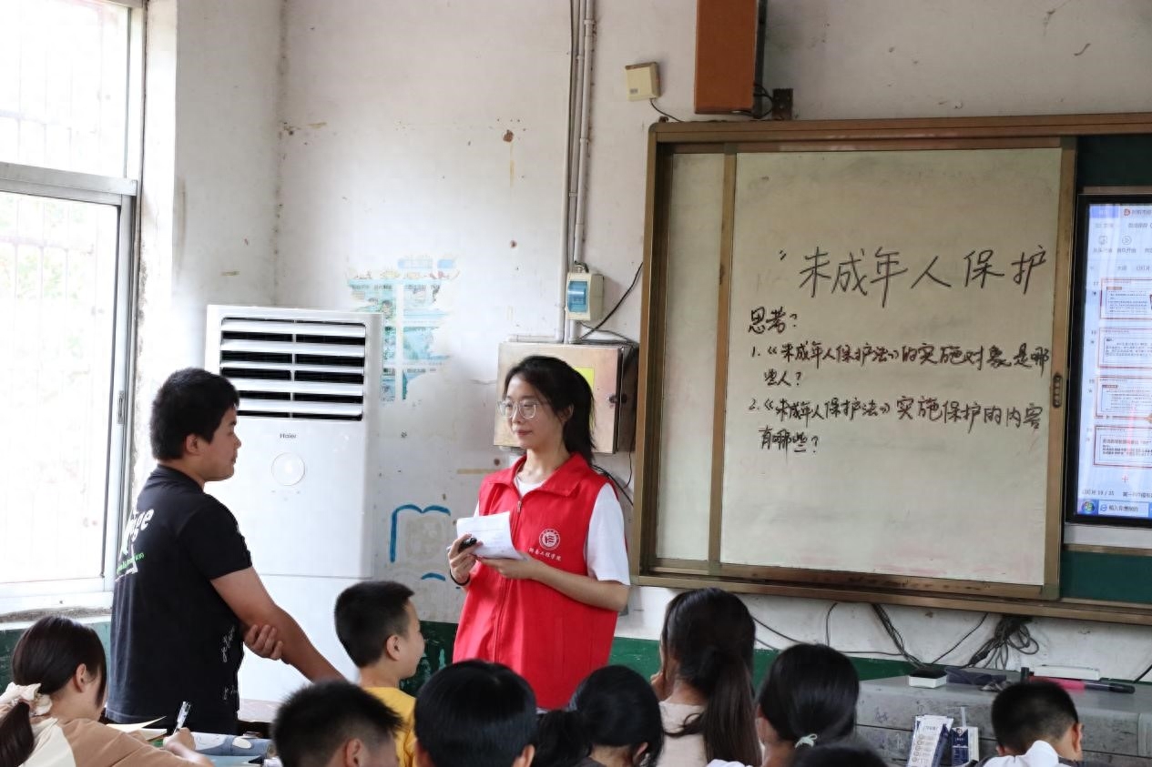 图为实践团成员向中路铺中学的学生进行未成年人保护法知识普及。龚艳星 摄