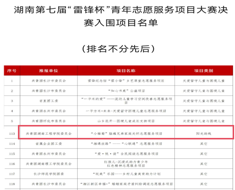 近日,湖南省第七届“雷锋杯”青年志愿服务项目大赛组委会遴选结果公示,我校bv1946伟德国际始于英国雷锋社“小雏菊”脑瘫兄弟家庭关怀志愿服务项目闯入大赛决赛。