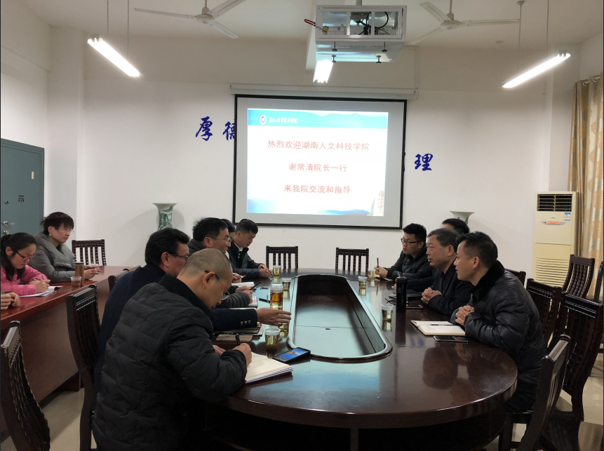 12月7日上湖南人文科技学院能源与机械工程学院谢常清院长一行13人来我院考察交流,理学院院长邓永和、党总支书记刘洁纯、副院长杨继明、党总支副书记陈亚琼在理学院G207会议室接待了来宾。理学院物电教研室、大学物理教研室、物理实验中心、院办和学办部分老师参加了会议。