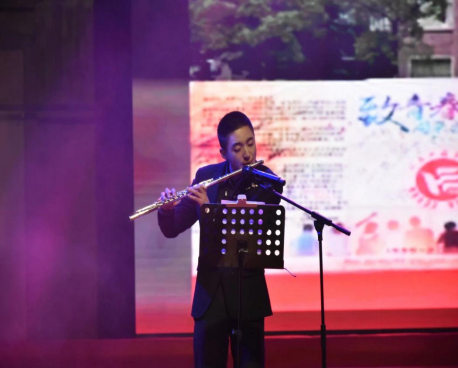 图九王冠南在元旦晚会上用长笛演奏《大鱼》