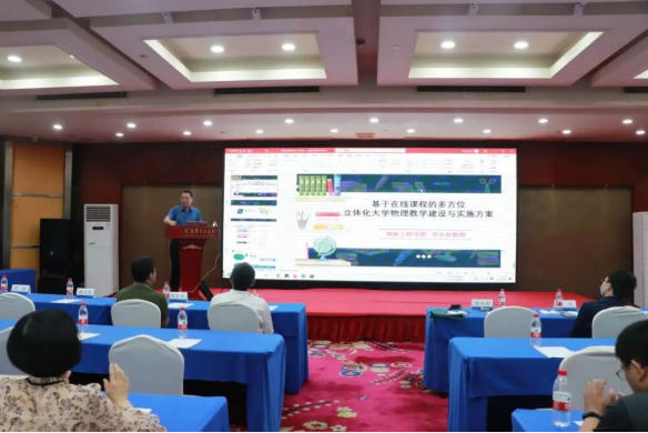 邓永和的报告以《基于在线课程的多方位立体化大学物理教学建设与实施方案》为题,通过分析不同层级学校学生知识掌握程度,从教学分析、教学设计、教学过程、教学成果4个方面,展示了 “传统教学课堂”、“网络虚拟课堂”和“实践创新课堂”构成的三位一体大学物理课程教学混合型新模式。