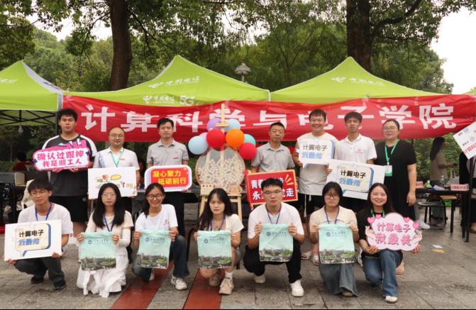 在迎新现场,学院精心准备了迎新大礼包,有学院logo的定制书签、定制本子、定制笔等学习用具。不仅如此,学院学生设计了“湖工计算电子大家庭”迎新签名墙,新生收到树叶小木牌,签名后放入树形“湖工计算电子大家庭”签名墙空心木板中,寓意为片片树叶汇集成大树,寄托着学院对2024级新生的殷切期望。