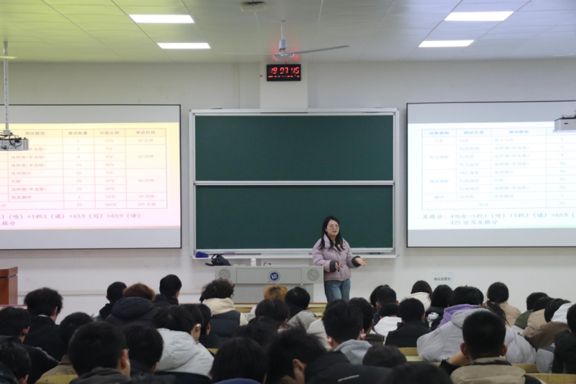 为帮助我院学子精准掌握大学生英语四级考试核心要点,有效突破备考瓶颈,12月8日晚,由学院学生工作办公室组织的“直击考点,决胜四级”考前专题讲座,在主校区教学主楼D102顺利举行。本次讲座特邀资深英语讲师纪芬主讲,学院众多四级备考学子踊跃到场参与,现场学习氛围浓厚。