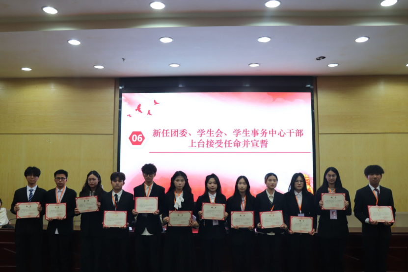 会上为2025至2026学年学生联合会干部颁发聘书,并对优秀学生干部、学生干事、优秀基层团支部干部、迎新工作志愿者先进个人表彰和颁奖。