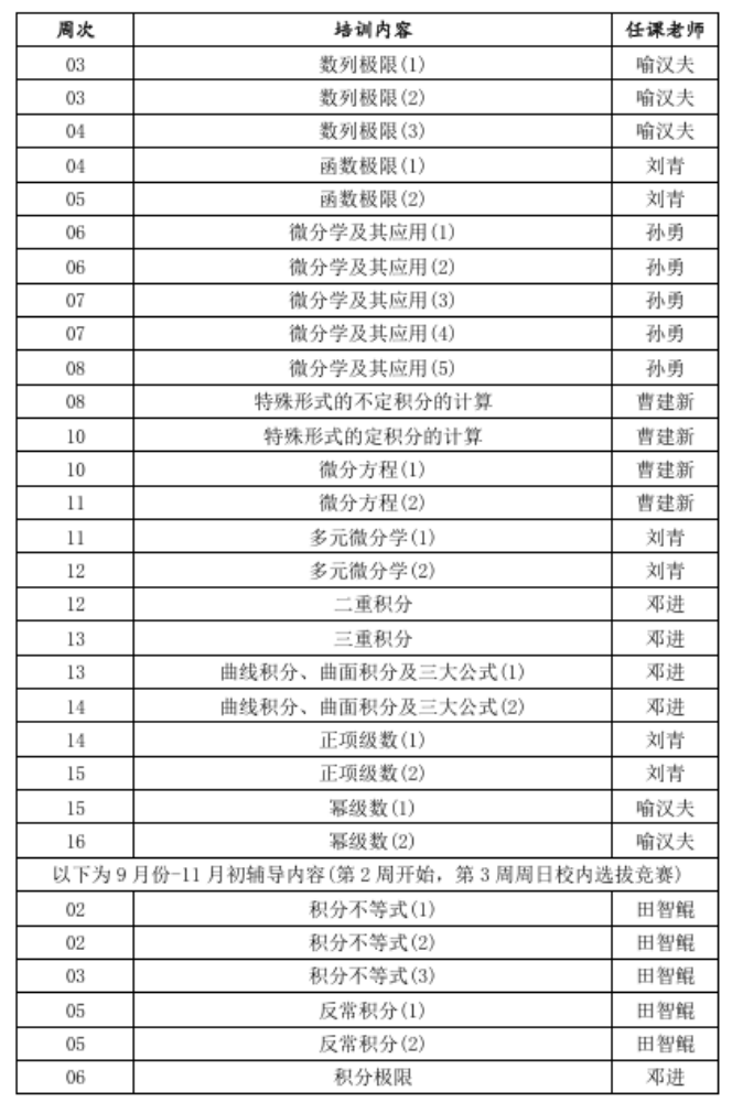 2.校内选拔赛将于9月底(暂定)举行,请认真做好备考准备。校内选拔赛(笔试)内容:非专业组:高等数学;专业组:数学分析、高等代数、解析几何。