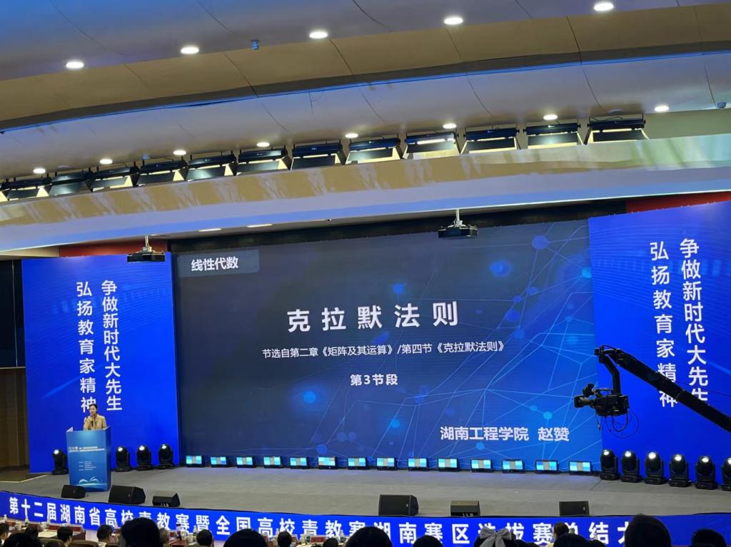 2024年6月24日上午,由湖南省总工会和湖南省教育厅联合举办,湖南省教育工会和湖南省教育科学研究院承办的第十二届湖南省高校青年教师教学竞赛暨全国高校青年教师教学竞赛湖南赛区选拔赛在湖南中医药大学圆满落幕。我院青年教师赵赞,经过校赛、省级复赛顺利进入决赛,最终以理科组第三名的成绩荣获一等奖,并被授予“湖南省教学能手”荣誉称号。上午9时,大赛的总结大会在湖南中医药大学准时召开,在理科组专家中南大学党委常委、副校长何军教授点评本次“青教赛”理科组课堂后,我院青年教师赵赞作为优秀青年教师代表,为全场观众带来《线性代数》的课堂教学片段分享。