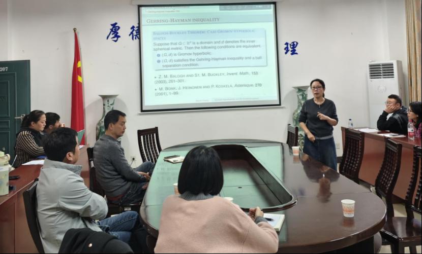 报告会上,黄曼子教授系统梳理了拟共形映射与Gromov双曲理论的发展脉络,介绍了她的团队近期研究成果:理清了球分离条件与Gehring-Hayman不等式两大几何条件间的内在关联,肯定性证明了Balogh-Buckley于《Invent. Math.》(2003)中提出的猜想;创新提出不依赖测度的方法,用于建立一般真欧氏子域的Gromov双曲性几何刻画,解决了Bonk-Heinonen-Koskela在《Asterisque》(2001)中提出关于无界欧氏子域的猜想。报告后,黄曼子教授耐心解答了青年教师提出的疑问,并为青年教师在学术成长方面提供了具体建议。
